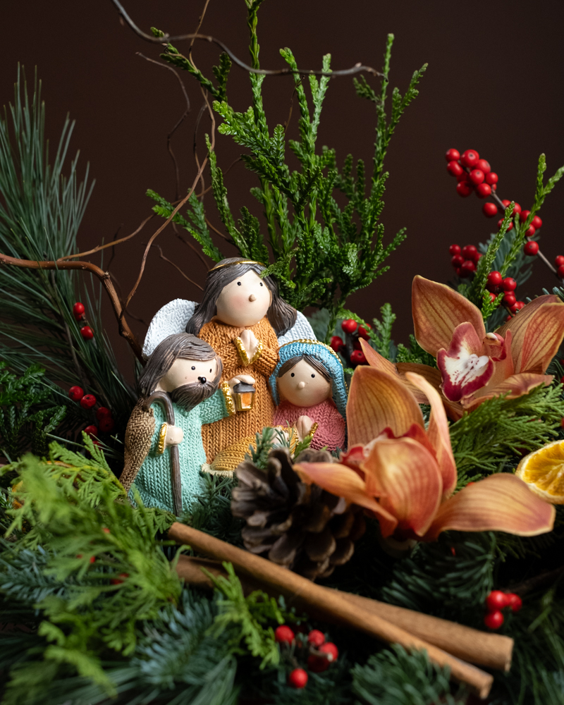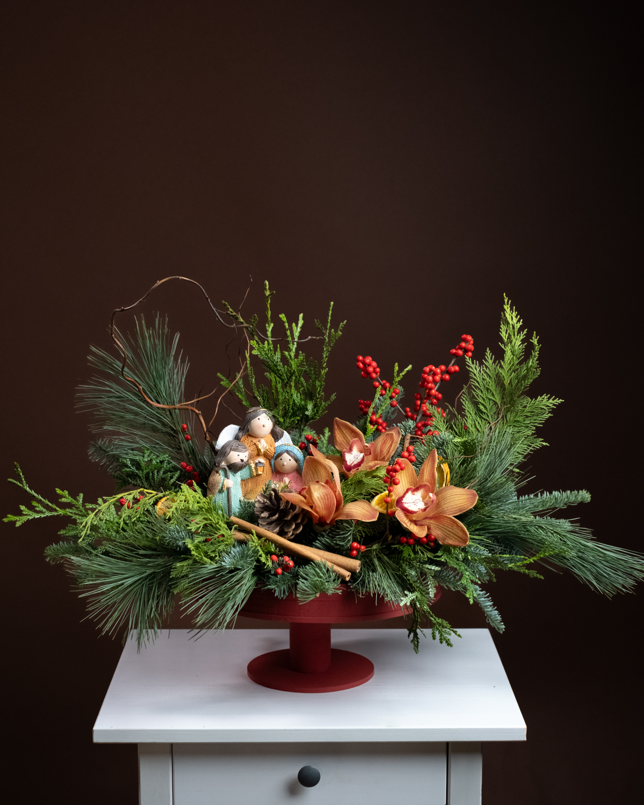 Aranjament floral de Crăciun cu orhidee Cymbidium, ilex, brad natural și figurină Nașterea Domnului – un decor festiv elegant, perfect pentru masa de sărbătoare sau cadou cu suflet.