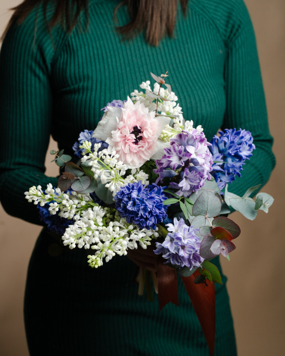 O compoziție parfumată și plină de prospețime, care îmbină delicatețea anemonei roz-pal cu textura intensă a zambilelor albastre și mov, completate de ramuri de liliac alb și eucalipt. Un buchet vesel și echilibrat, care aduce un strop de culoare și un parfum irezistibil. Este realizat din 1 fir de liliac, 7 zambile multicolore, o anemona si eucalipt.