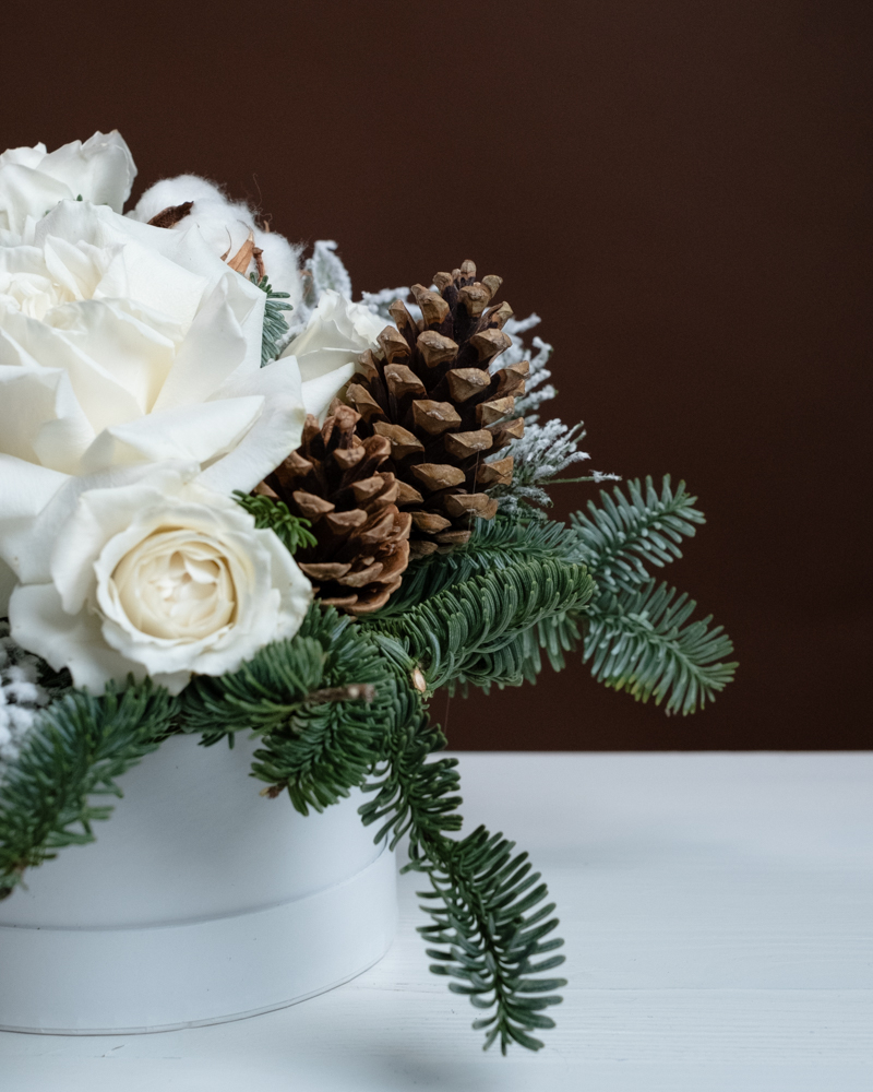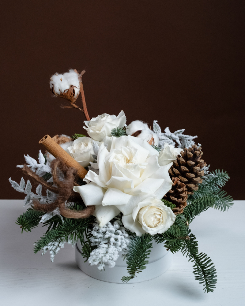 Un aranjament floral de iarnă gândit pentru iubitorii de simplitate, liniște și rafinament. Trandafirii albi și florile ivoire sunt așezate într-o bază rotundă, alături de crenguțe înzăpezite, conuri de brad, bumbac pufos și scorțișoară, pentru un decor elegant cu parfum de sărbătoare.