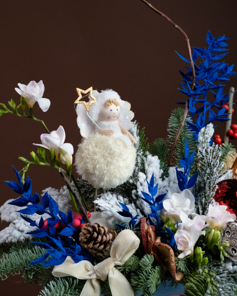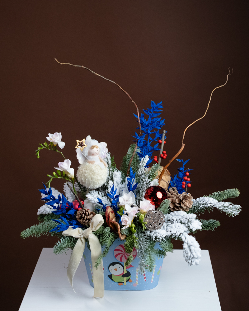 Un aranjament floral de iarnă care îmbină magia copilăriei cu farmecul sărbătorilor. Construit într-un recipient vesel cu ilustrații de sezon, decorul aduce împreună ramuri de brad și conifere înghețate, elemente albastre vibrante, conuri de brad, bobițe de ilex și decorațiuni de Crăciun precum globuri, scorțișoară și un înger delicat cu aripi moi.